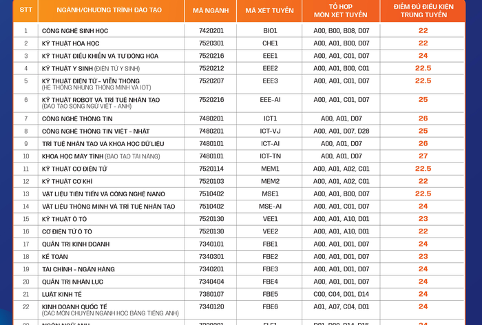 Cụ thể, 17 ngành có điểm chuẩn từ 29 trở lên, trung bình mỗi môn 9,7 điểm. Riêng bốn ngành Công nghệ thông tin, Thương mại điện tử, Kinh doanh quốc tế, Logistics và chuỗi quản lý cung ứng hệ đại trà lấy điểm chuẩn 29,75. Nếu không có điểm ưu tiên, thí sinh phải đạt điểm trung bình mỗi môn từ 9,9 trở lên mới trúng tuyển.
