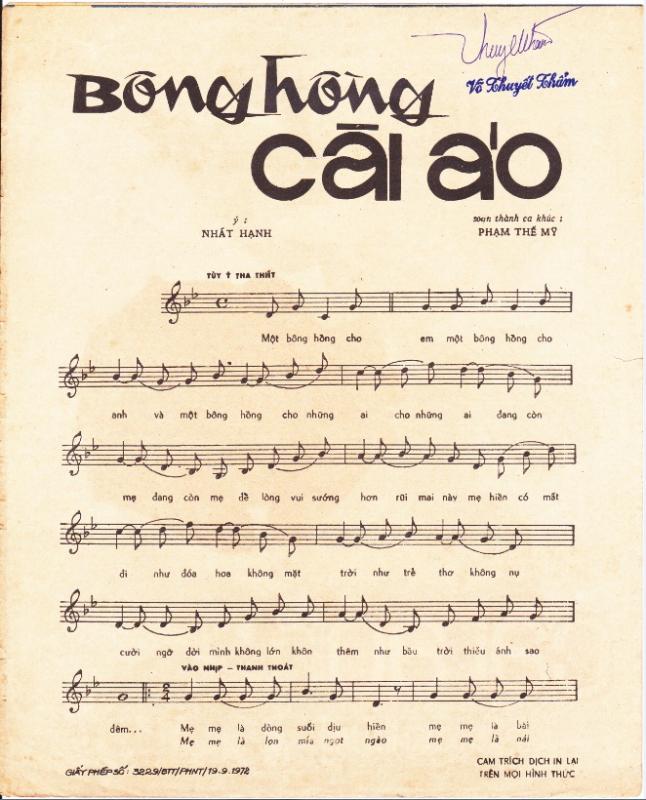 Bài hát “Bông hồng cài áo” là một sáng tác của nhạc sĩ Phạm Thế Mỹ, được tác giả phổ nhạc từ áng văn của thiền sư Thích Nhất Hạnh. Sư Thích Nhất Hạnh tên thật là Nguyễn Xuân Bảo là người vận động hòa bình cho Việt Nam, ngoài ra ông còn là nhà văn có bút danh là Nguyễn Lang. Sinh ra tại Thừa Thiên Huế, nơi được xem là cái nôi của nền phật giáo Việt Nam. Từ năm 16 tuổi ông đã xuất gia nương nhờ cửa phật.