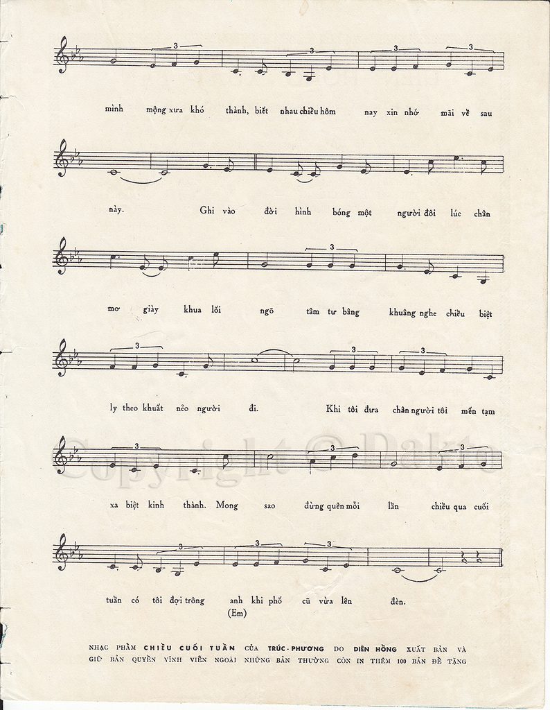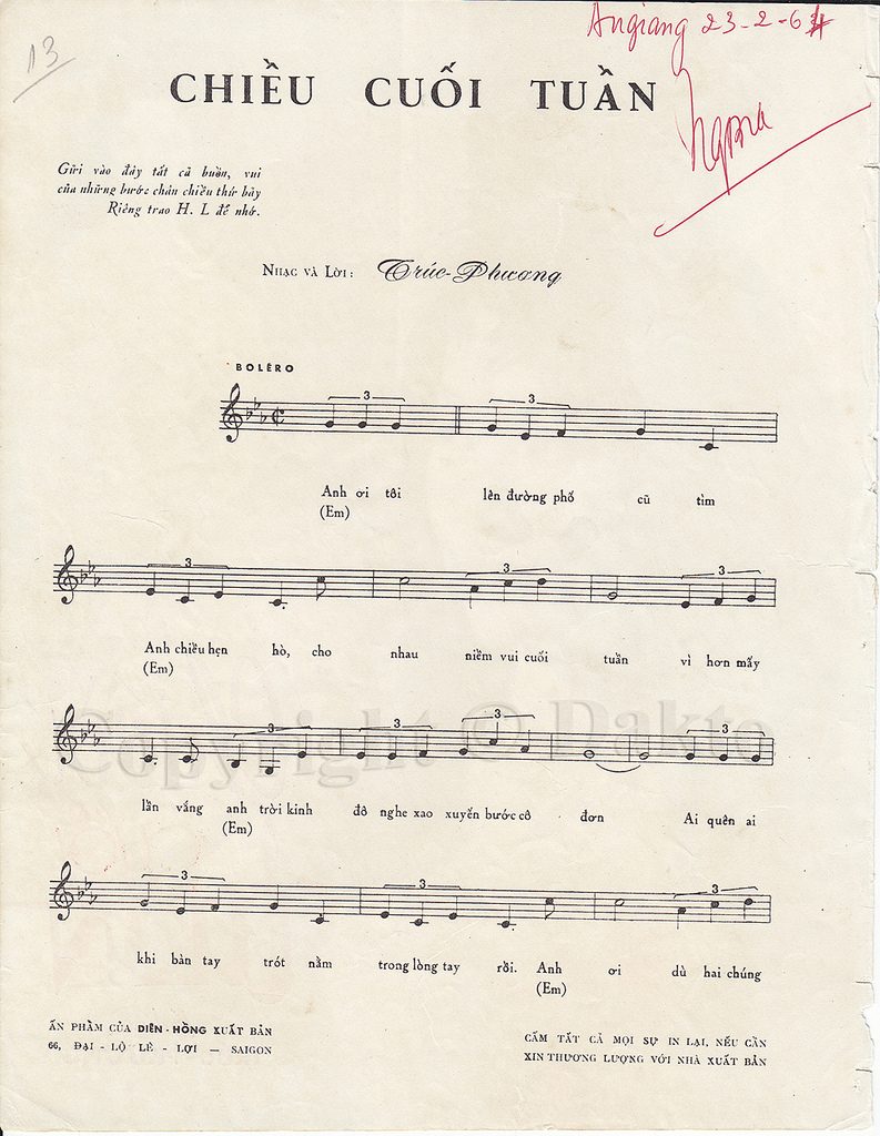Bài hát Chiều cuối tuần cũng là một trong những ca khúc được ra đời vào cuối thập niên 1950. Nội dung bài hát thể hiện tình yêu lứa đôi xa cách nhau về mặt địa lý, tuy vậy họ luôn nhớ về nhau, nhớ về những lần hò hẹn vào mỗi cuối tuần.