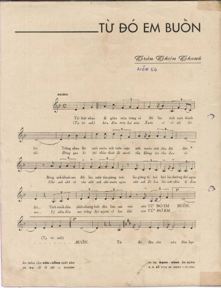 “Từ đó em buồn” một sáng tác của nhạc sĩ Trần Thiện Thanh được ra đời vào năm 1964. Bài hát được thu âm trong cuốn băng nhạc “Triệu đóa hồng cho người phụ nữ Việt Nam” do trung tâm Dạ Lan ở Hoa Kỳ phát hành.