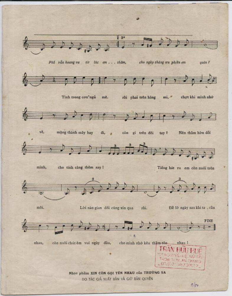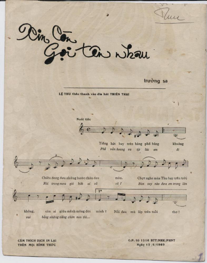“Xin còn gọi tên nhau” là mạch cảm xúc trào dâng trong khi ông đang lái chiếc lambretta của mình rong ruổi trên đường phố Sài Gòn năm 1969. Sợ dòng cảm xúc ấy lạc trôi nên ông phải dừng xe lại giữa phố để chép lại những dòng nhạc ấy. Chỉ trong vài giờ đồng hồ sau khi về nhà, ông đã hoàn thành xong bản nhạc.